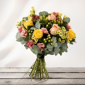 A pretty floral bouquet, the Pentney makes a gorgeous gift for a special occasion. We use sunshine yellow roses, dusty pink lisianthus, dainty yellow daisies, and silvery eucalyptus foliage to create a beautiful hand-tied bouquet.