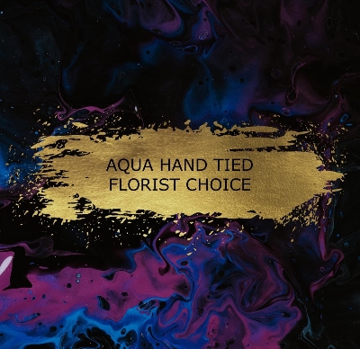 Hand tied aqua is a design that’s tied with stems shortened to sit in a bubble of water, in a gift box.